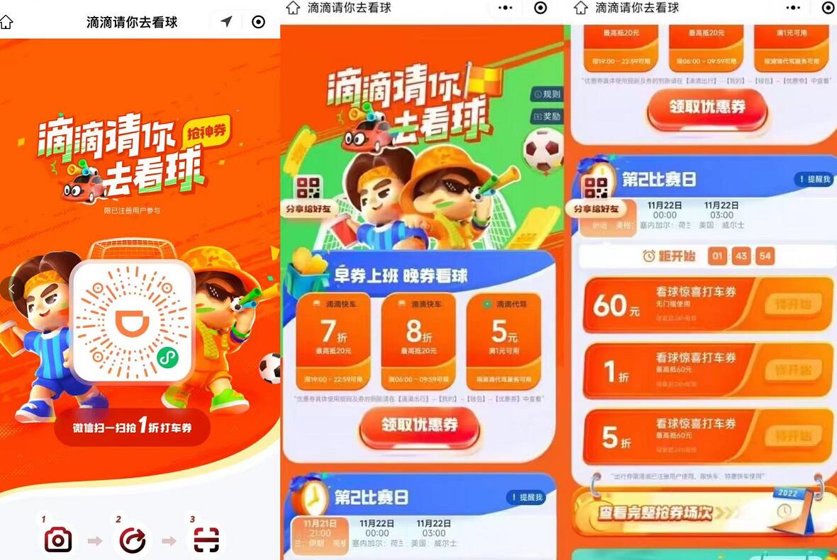 下拉根据页面提示时间领取60元、1折、5折无门槛打车券!