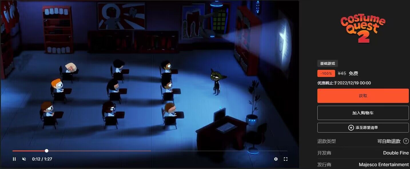 【Epic喜 1】接下来连送15天,每天一款游戏!免\u202A费领\u202A取电脑游\u202A戏《万圣节大作战2》,一款卡通的回合制冒险游戏,领\u202A取时间截止到12月18日23点。https://store.epicgames.com/zh-CN/p/costume-quest-2