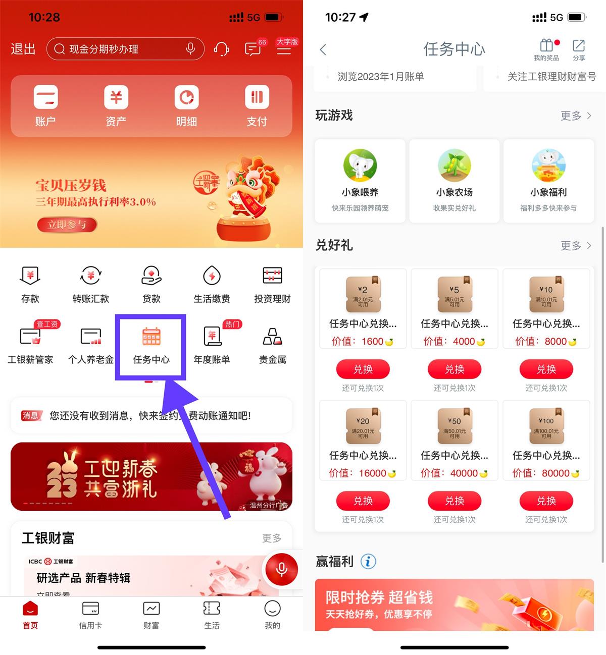 工行APP搜索“任务中心”进入->签到和做任务得香蕉->累计香蕉兑换1~100元立减金