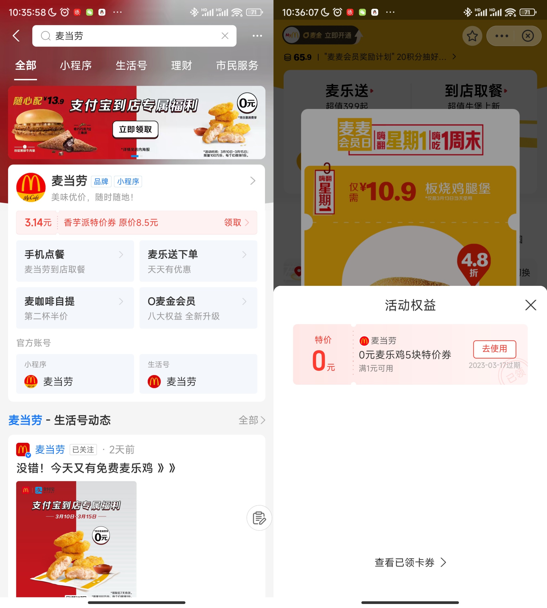 支付宝app搜索“麦当劳”、横幅进去弹窗领取,今天就能用!