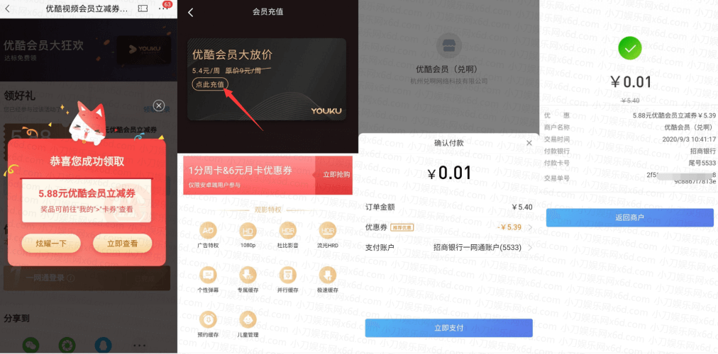 领取券后立即使用卡券->点击充值->到最后付页面就会显示0.01->秒到