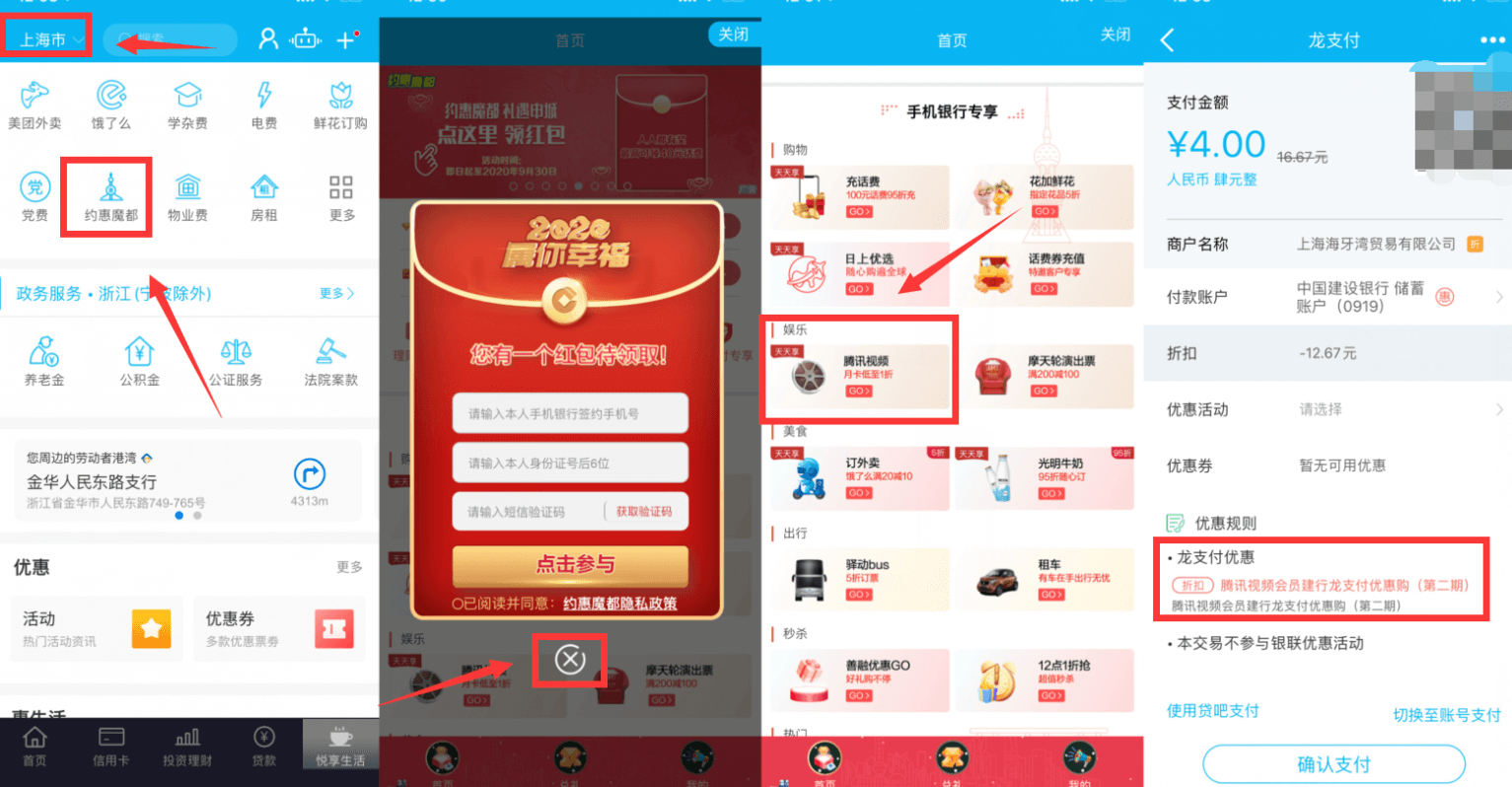 打开中国建设银行APP--底部【悦享生活】-左上角修改【上海市】【约惠魔都】