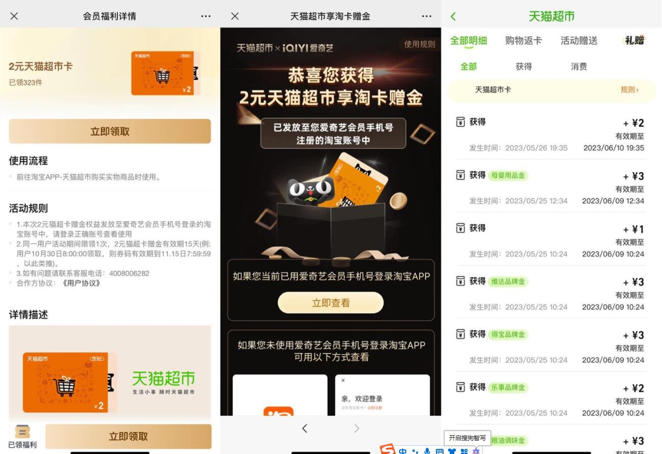 打开地址->登陆后直接领2元猫超卡,在天猫超市明细中查看