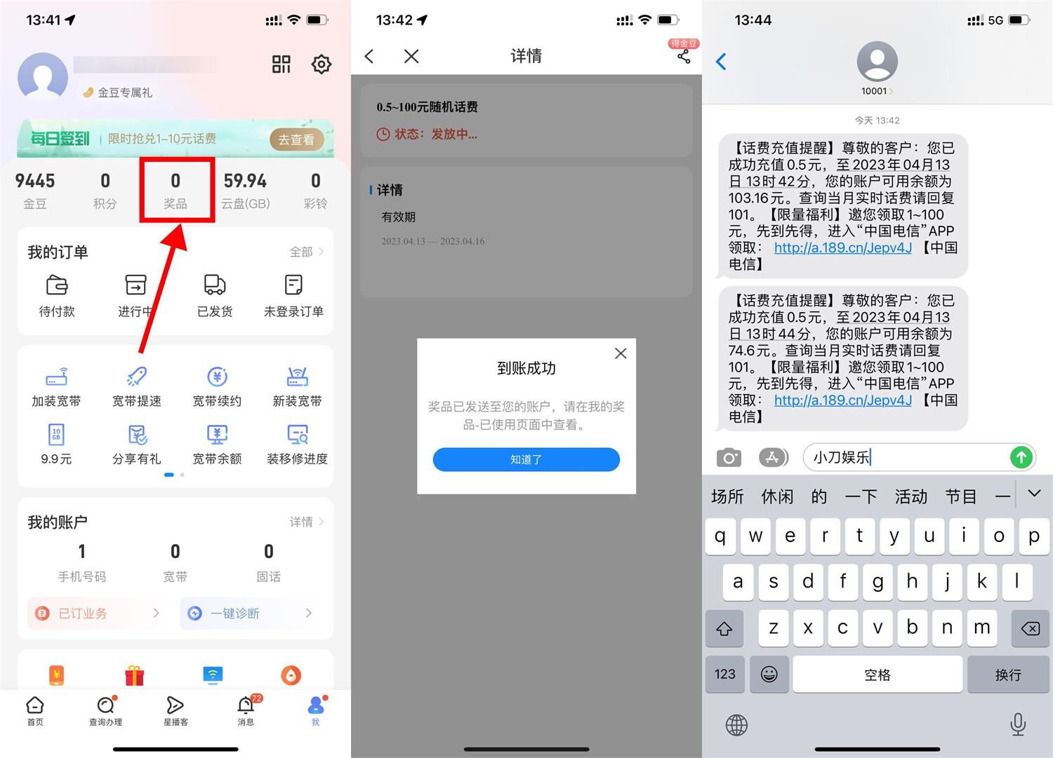 电信APP->我的->奖品->输入自己地区对应省份的囗令抽话费