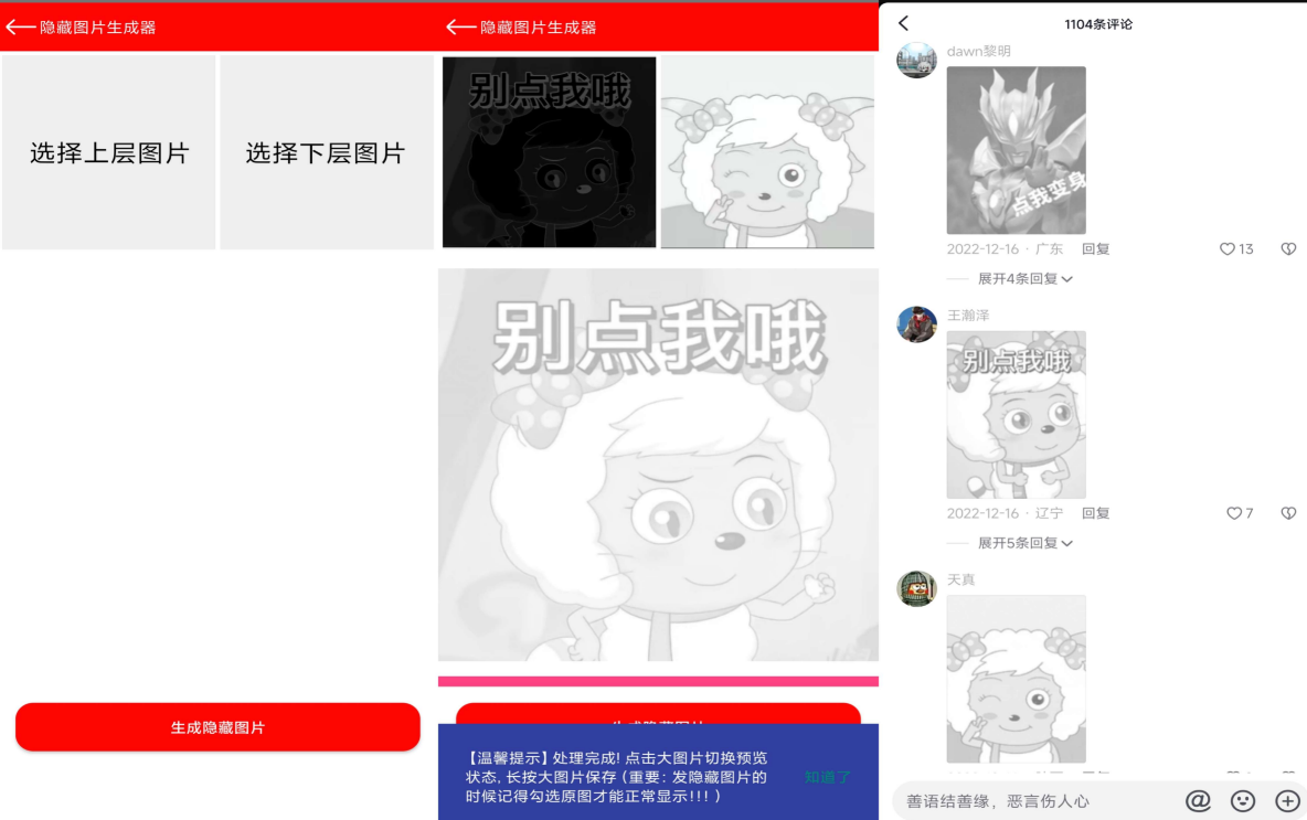 <p>一款最近很火的隐藏图生器,选择图一键制作 十分神奇,比如说缩略图吸引眼球的内容,比如是个子,别一点开变了骂的表包,非常的有意思,还有表白什么的,自己可以发挥。</p>
