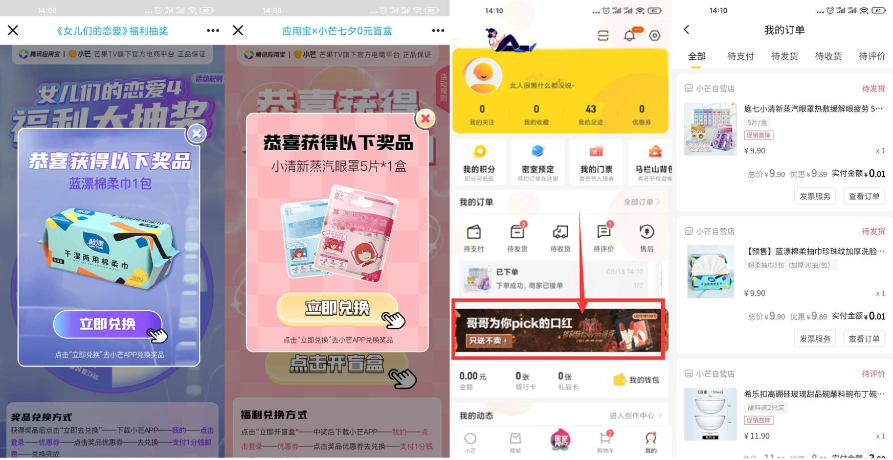 1、依次打开4个链接抽奖!中5元优惠券没用->只认抽中实物才有用->然后下载小芒APP
